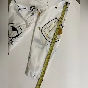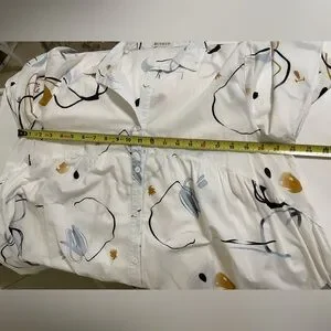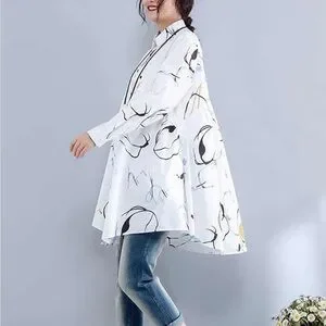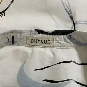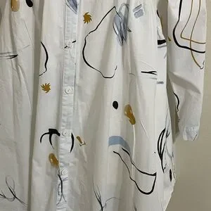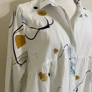 BUYKUD White Cotton Tunic Button Down Top Abstract Artsy Print Flowy Fit Medium