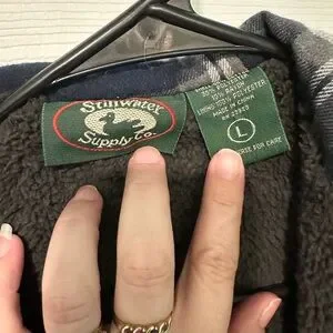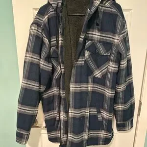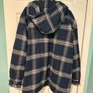 Navy plaid hooded shirt jacket with warm sherpa lining for chilly days. Zip-front closure and multiple pockets for secure storage. Relaxed fit designed for comfortable everyday layering in navy and white plaid.