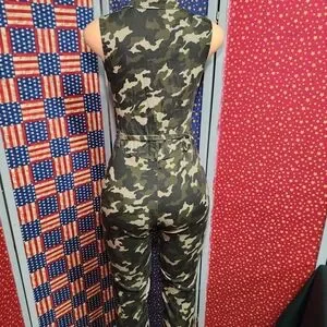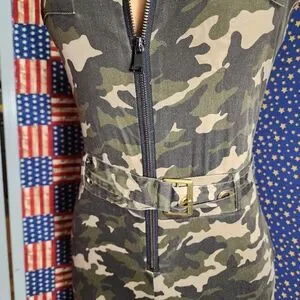 Sleeveless jumpsuit in green camouflage print with a front zipper for easy wear. Defined waist with belt detail creates a flattering silhouette. Stretchy fabric for comfortable, all-day movement. Versatile camo style for casual or streetwear looks.