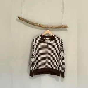 Soft, textured knit pullover in a warm brown and cream stripe. This piece features a relaxed, slightly cropped fit with a ribbed neckline, hem, and cuffs. The subtle waffle-like texture gives it dimension while still feeling lightweight and easy to wear. A great transitional layer that pairs well with denim, trousers, or layered over a longer tank for added length.