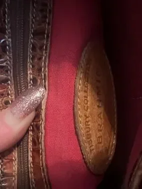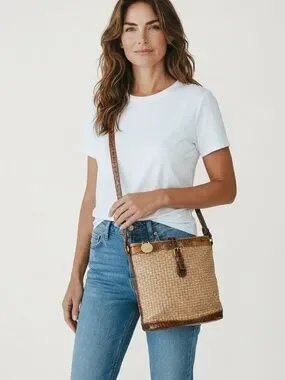 Brahmin vintage woven straw crossbody bag with signature croc-embossed leather trim and adjustable strap.