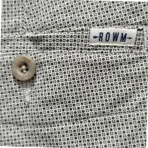 ROWM flat front chino shorts feature a sophisticated geometric micro-print in a versatile grey and white color palette. Crafted from a comfortable cotton blend with a hint of spandex for stretch, these shorts offer a classic fit with a zip fly and button closure. Functional details include two front slant pockets and two rear button-through welt pockets, making them perfect for casual summer outings or a polished weekend look.