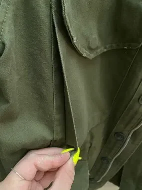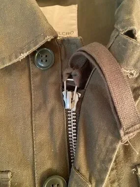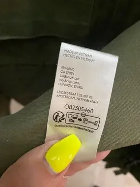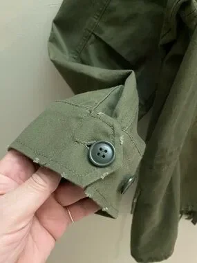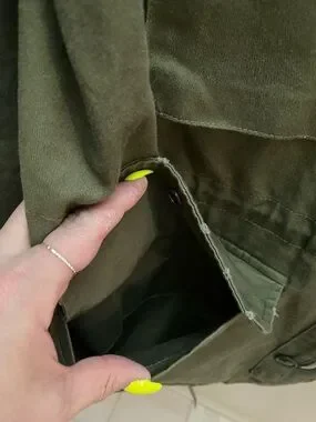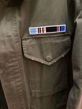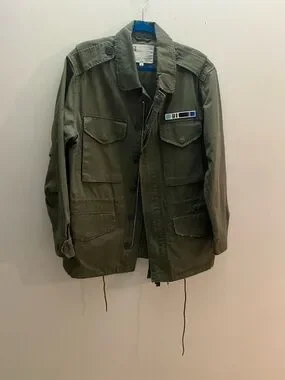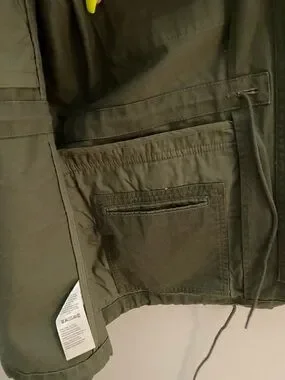 New without tags. Lightweight olive colour utility jacket with multiple flap pockets. Button-front placket and epaulet accents. Subtle embroidered patch for a casual touch. Drawcord waist and hem for adjustable fit. Versatile, easy-to-style layering piece.