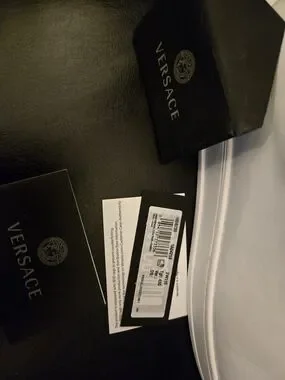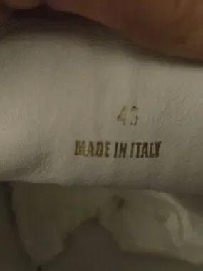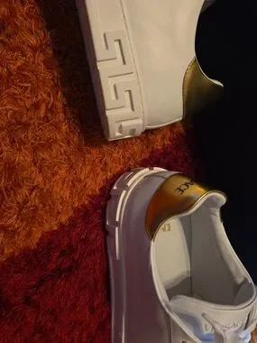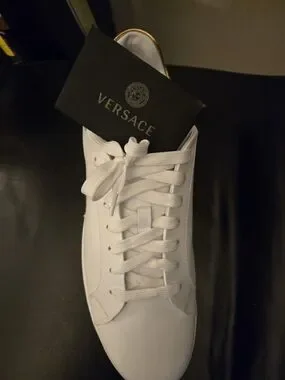 Premium white leather athletic sneakers by Versace. Gold stamped size and origin marking inside. Sleek low-top silhouette with minimalist styling. Luxury Italian construction and subtle luxe accents.