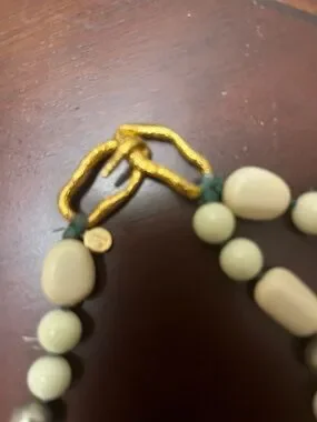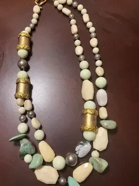 Necklace is 24” long , gold tone with moss agate and turquoise with pearls intertwined