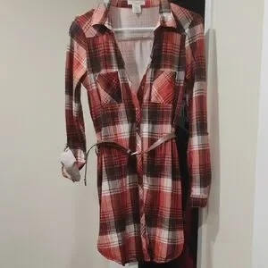 Long-sleeve plaid shirt dress. Button-front with chest pockets and an adjustable accent belt. Lightweight, casual style. Red, black and white plaid pattern.