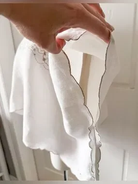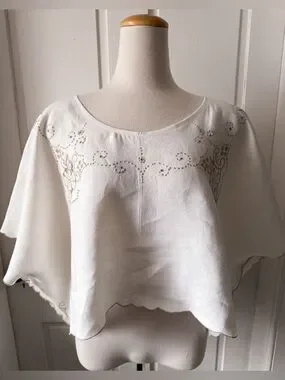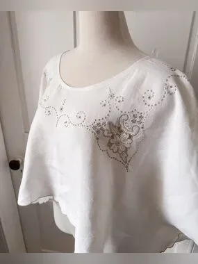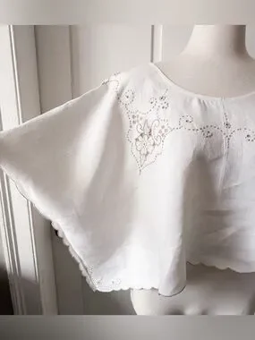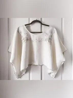 A lovingly handmade linen top upcycled from a vintage embroidered table cloth. This piece features delicate hand-embroidered floral and swirling motifs in soft beige that trace the wide neckline and shoulders, lending a quietly elegant, vintage-inspired charm; the lightweight, breathable linen drapes into a relaxed, poncho-like silhouette with softly scalloped edges and flowing sleeves that move beautifully and feel effortless to wear, making it equally lovely as a breezy summer blouse or a refined layering piece for cooler evenings.