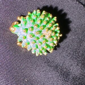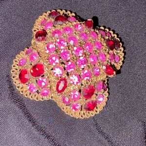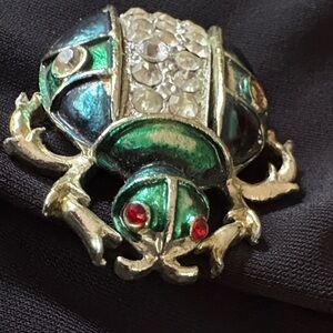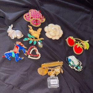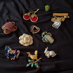 Set of decorative women’s brooch pins in gold-tone metal with red, green, and white accents. Includes playful motifs like cherries, a floral camellia, jeweled beetle, rabbit, horse, bird and heart designs. Adds instant personality to jackets, scarves, bags, and hats. Easy to mix-and-match for polished, feminine styling.Vintage and excellent condition. All work