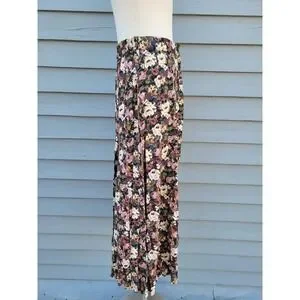This vintage Compagnie Internationale Express skirt features a stunning dark floral print with lush roses in shades of burgundy, pink, and cream. The high-waisted silhouette is accented by a full button-front closure and an elasticized back waistband for a comfortable fit. Crafted from lightweight 100% rayon, it offers a beautiful drape and a flowy, romantic feel that's perfect for transitional seasons or a cottagecore-inspired look.