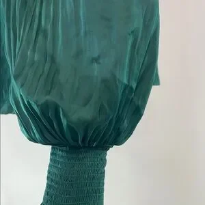Green satin (100% Polyester). Top. Long sleeves. Crewneck. Back button closure. 23.5" from shoulder to hemline. Imported.