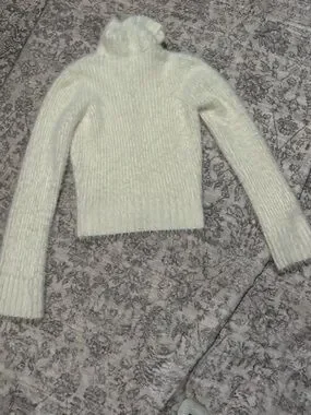 Soft fuzzy knit in a cream/white hue. Slim, slightly fitted silhouette. Long sleeves with subtle ribbed hem. Cozy, lightweight layer for everyday wear.