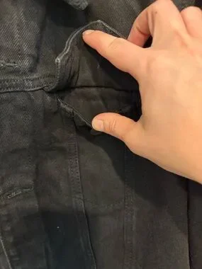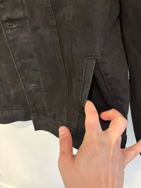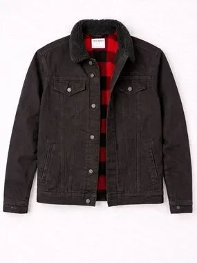 Men’s Old Navy black denim jacket with cozy sherpa lining and red buffalo plaid interior. Classic trucker style with a warm, rugged feel—perfect for fall and winter layering.