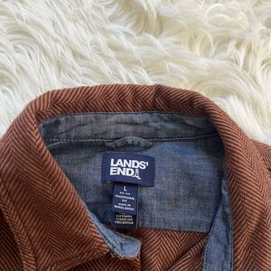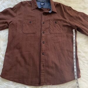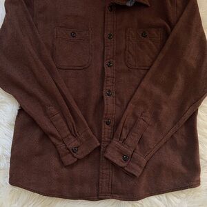 Button-front shirt jacket with a subtle herringbone texture. Features a soft chambray-style inner collar. Clean, casual layering piece for everyday wear. Great condition no flaws