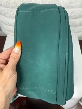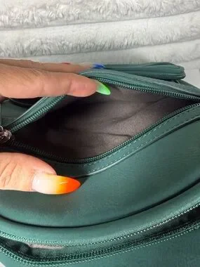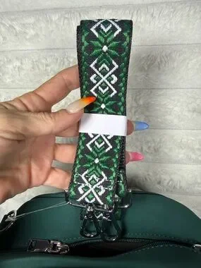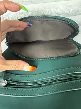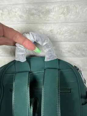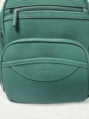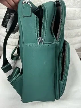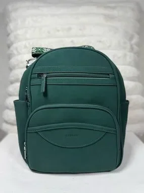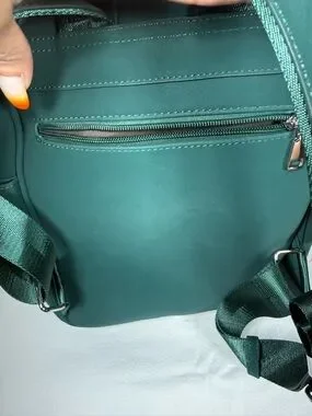 Stylish green backpack designed for everyday use. Soft faux-leather finish with a patterned shoulder strap for a modern look. Multiple zip pockets keep essentials organized. Comfortable padded straps for all-day wear. Versatile green color complements casual and dressy outfits.
