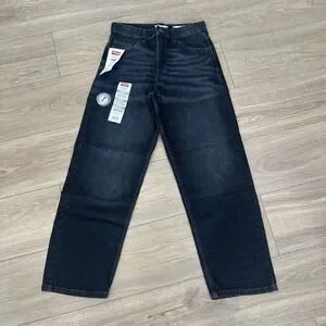 The NEW Wrangler Boys Five Star Premium Loose Jeans in Black, size 14 Regular, are designed for boys who love a relaxed fit. Made from dark wash denim, these jeans feature a straight leg style with a 27-inch inseam. The denim fabric is machine washable for easy care, making them a durable and practical wardrobe staple for any young boy. The premium quality Wrangler brand ensures both style and durability, perfect for everyday wear.
