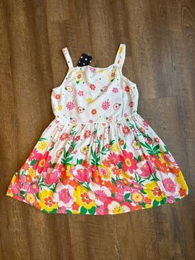 Lightweight white sundress featuring bright pink, yellow and orange floral print. Strappy design with a gathered skirt for playful movement. Soft, breathable fabric keeps her comfortable all day. Easy-to-style seasonal dress for casual outings and vacay.