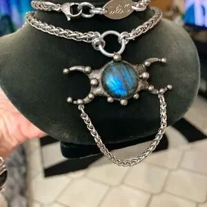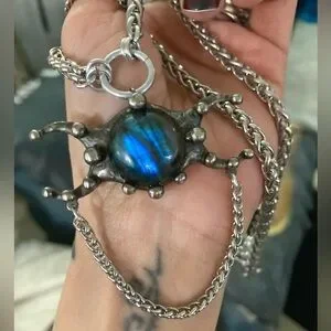 Natural dark blue iridescent flash labradorite gemstone triple moon goddess charm boho goth necklace . Wheat style Chain is stainless steel material . Adjustable 15 to 16 inch long ( If you need a different length chain lmk before purchase it is handmade could adjust ) Genuine Natural blue labradorite stone . Moon phase charm is black Electroplated material .