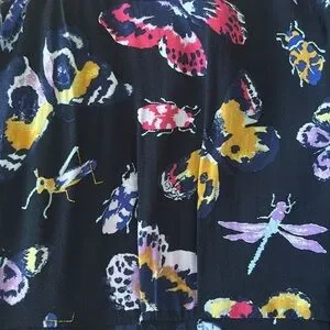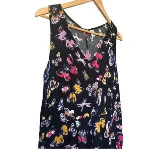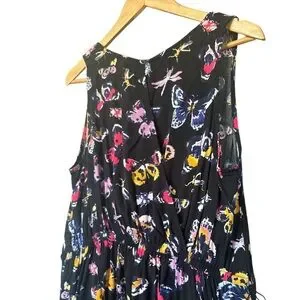 DESCRIPTION: Made from rayon, this breezy lightweight one-piece romper can be machine washed for easy care. It’s perfect for casual wear or travel. The V-neckline and pull-on closure with a button at the neck make it easy to wear, while the elastic waist and pockets make for comfort and practicality! Crossover back. Colourful Butterflies and insects on a black background. *Has small belt loops but no belt. Can easily add your favourite belt in almost any color to switch up your look.