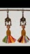 Boho tassel earrings with antique brass details, patterned wooden beads, and colorful fringe.
