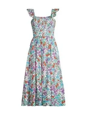 Smocked bodice with ruffle shoulder straps. Flowy midi skirt with pockets. All-over floral print in vibrant hues. Casual yet feminine style.