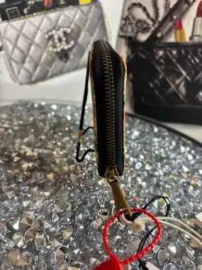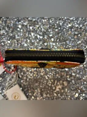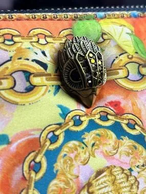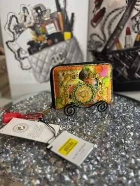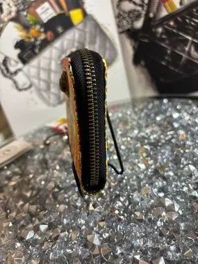 Design: A small, zip-around style wallet with a signature antiqued gold eagle head embellishment on the front.