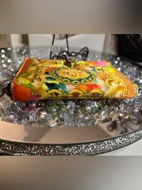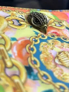It is characterized by its vibrant orange and multi-colored scarf-style print, which features chain links and floral or tropical motifs.