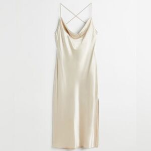 Straight-cut, calf-length slip dress in softly draped satin. Extra-narrow shoulder straps crossed at back. Draped neckline at front and low-cut, low-cut, draped back, and straight-cut hem with high slit at one side.