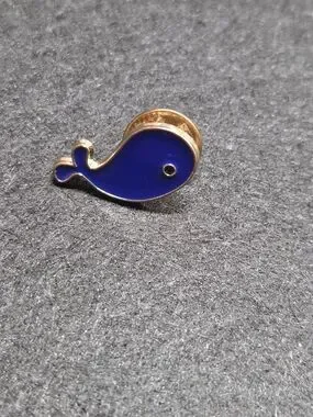 Cute whale-shaped enamel pin. Deep navy blue enamel with gold-tone metal trim. Secure clutch backing. Great for jackets, bags, and hats.