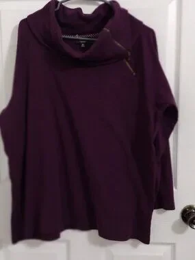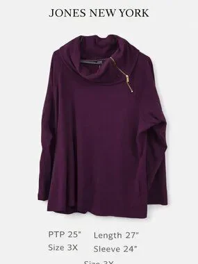 Jones New York Signature women’s top in size 3X. Beautiful rich purple color with a soft cowl neck and stylish zipper accent detail for an elevated casual look. Made of 100% cotton for breathable comfort.