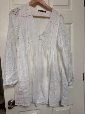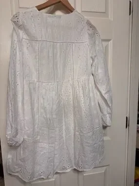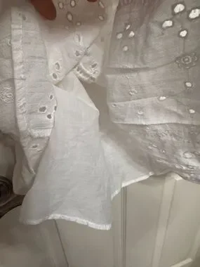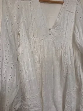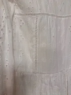 Washed but has not been worn. Delicate eyelet detailing on soft white cotton. Feminine scalloped trim. Lightweight and breathable. Easy to style with skirts or jeans.