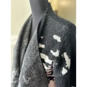 Keywords: POL sweater, abstract print, open front, long sleeve, designer knit, statement piece, fashionable, casual wear, cozy, modern, stylish, outerwear, women's fashion