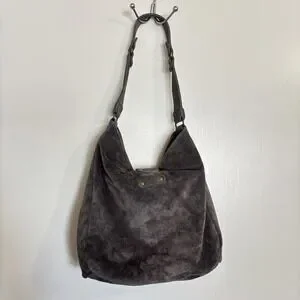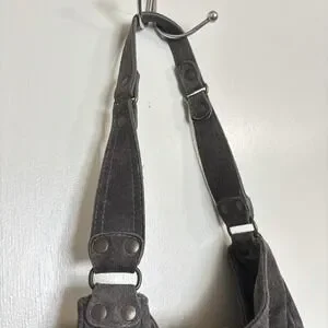 Stylish and versatile ABACO shoulder bag crafted from soft dark gray suede. This bag features a spacious interior with a secure zippered compartment, perfect for keeping your essentials organized. The adjustable strap ensures comfortable wear, while the brass-tone hardware adds a touch of vintage charm. Ideal for everyday use or casual outings, this bag effortlessly complements any outfit.