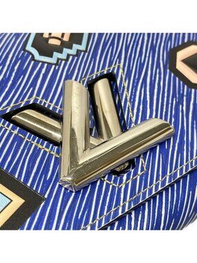 This is an authentic Louis Vuitton Twist Portefeuille Chain wallet in a bold blue leather. The design features a distinct V-shaped pattern across the exterior, accented with gold-tone hardware and geometric details.