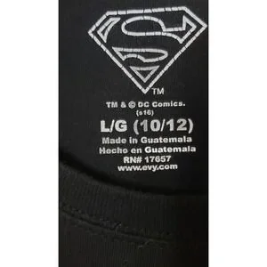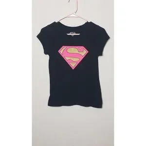 Keywords: Kids Girls T-Shirt, Superman Shirt, DC Comics Apparel, Superhero Graphic Tee, Pink Gold Logo, Black T-Shirt, Kids Size 10 12, Girls Clothing, Casual Top, Playwear, Character Tee, Licensed Merchandise, Evy of California, Shoulder Snaps