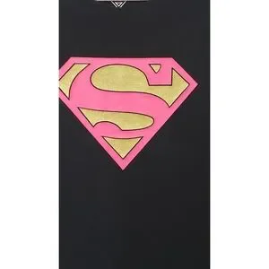 Embrace your inner superhero with this adorable black t-shirt, adorned with a vibrant pink and gold Superman logo that pops with heroic charm. This top features small metallic snaps on the shoulders for easy dressing, adding a touch of practical flair. Imagine your little one sporting this iconic emblem, ready for any adventure. Perfect for everyday play or casual outings, this shirt is a fantastic way to let her express her strength and spirit.