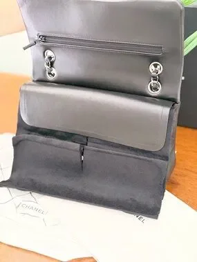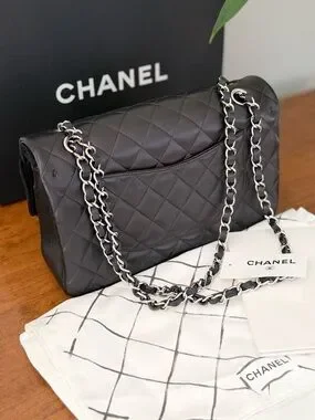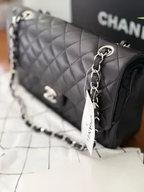 BRAND NEW WITH TAGS AND BOX. Classic quilted leather shoulder bag by CHANEL. Features silver-tone chain and CC turn-lock. Timeless silhouette for day or evening. Chain strap with leather woven detailing. Sleek black design with branded tag.