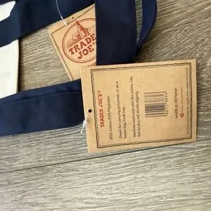 Viral Trader Joe’s tote. Large 15” x 20”. Durable natural color canvas tote with navy straps and base. Features a red Trader Joe's logo. Spacious, versatile carry for everyday errands and shopping. Lightweight and simple to pair with casual outfits.
