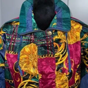 River Edge Sport track jacket in a size Medium featuring a vibrant and intricate baroque-inspired print. This eye-catching jacket has a collared neckline with a full zip closure and a comfortable elasticized hem and cuffs. Perfect for adding a bold statement to casual outings or athletic wear.