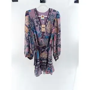 FARM Rio Wild Night Puff Sleeve V-Neck Belted Mini Dress Lavender Women's Large