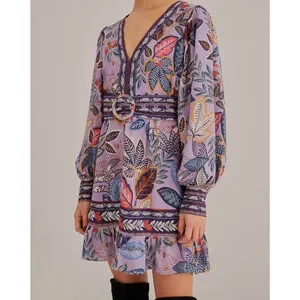 Farm Rio Wild Night dress, lavender mini dress, puff sleeve V-neck dress, tropical print mini dress, statement summer dress, vibrant printed dress, resort wear mini dress, stylish casual dress, bold fashion mini dress, Farm Rio clothing, playful summer outfit, colorful designer dress, chic daytime mini dress, trendy women's dress