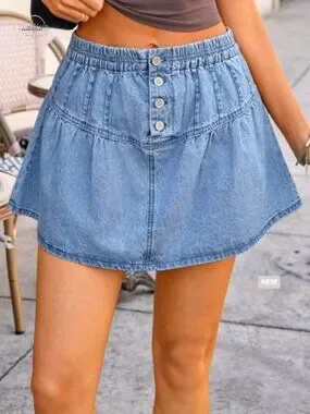 High Waisted Denim Pleated Mini Skirt with Built-in Shorts Summer A-Line