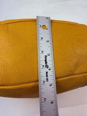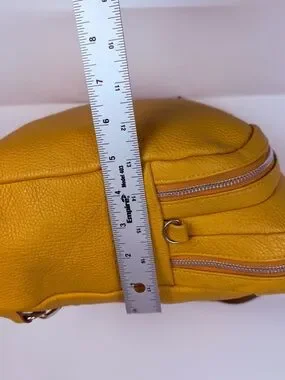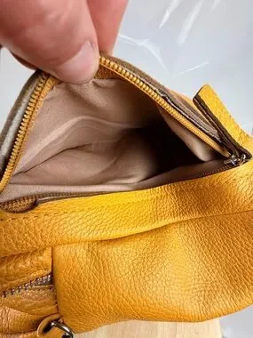 Soft pebbled leather mini backpack in a rich mustard yellow tone. Features multiple zip compartments for easy organization and adjustable straps that allow for backpack or crossbody wear.