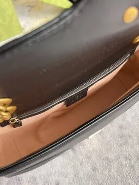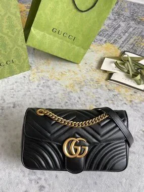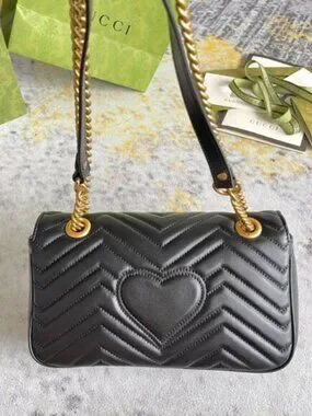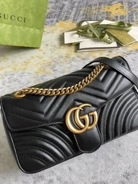 This luxurious Gucci shoulder bag showcases asophisticated black leather design with a distinctivechevron quilted pattern. The iconic double G logo inantique gold tone adds a touch of elegance,complemented by a versatile leather and chain strapfor both shoulder and crossbody wear.