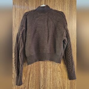 Elevate your cozy-chic style with this stunning Buffalo cable knit sweater. This piece features a beautiful, intricate design with classic cable knit patterns intertwined with delicate, three-dimensional floral details. The rich mocha brown color is perfect for fall and winter. It has a chic mock neck and a slightly cropped fit, making it ideal for pairing with high-waisted jeans or skirts. The long sleeves have ribbed cuffs for a comfortable and stylish finish. This sweater is in excellent condition and ready to be a standout piece in your wardrobe.