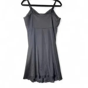 Classic black slip dress with delicate lace trim along the bust and hem. Adjustable spaghetti straps and silky nylon fabric make this a versatile layering piece or lingerie essential. In very good vintage condition.