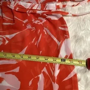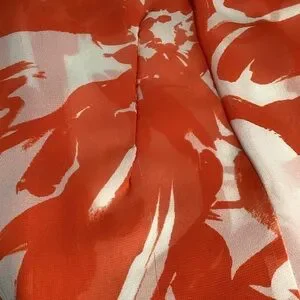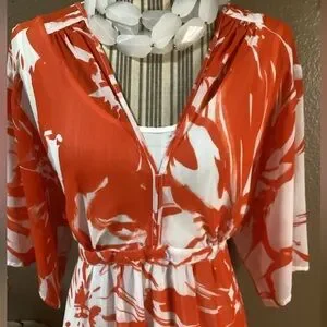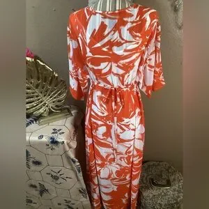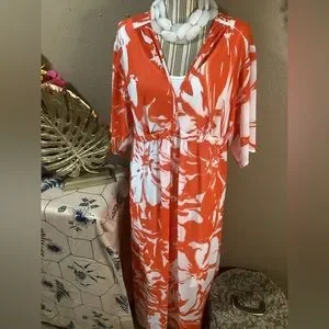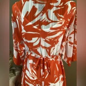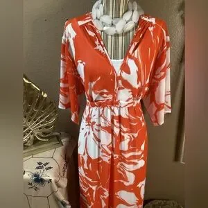 Vibrant orange and white floral design. Flattering fit with a relaxed silhouette. Ideal for casual or special occasions.