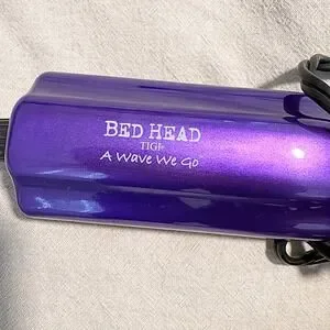 Bed Head A Wave We Go purple triple barrel waver hair tool. Creates beautiful beachy waves with ease. Features a unique triple barrel design for quick styling and a vibrant purple finish. Perfect for achieving a relaxed, tousled look for a day at the beach or a fun night out.