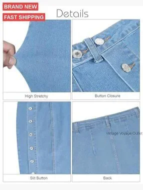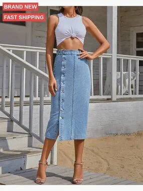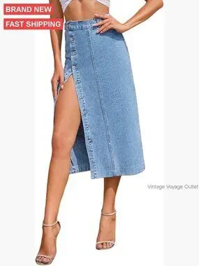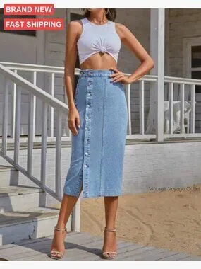 Stretch Denim Midi Skirt High Waisted Button Front Slit Casual