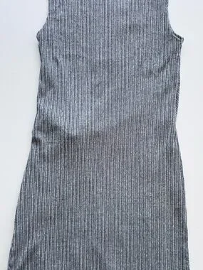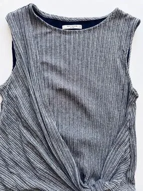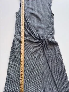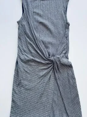 Sleeveless midi dress with ribbed texture. Twist-front detail creates soft drape. Streamlined silhouette for polished looks. Stretch knit for comfortable movement.
