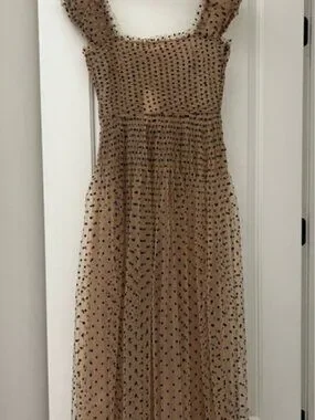 Charming midi dress with a tan base and black polka dots.